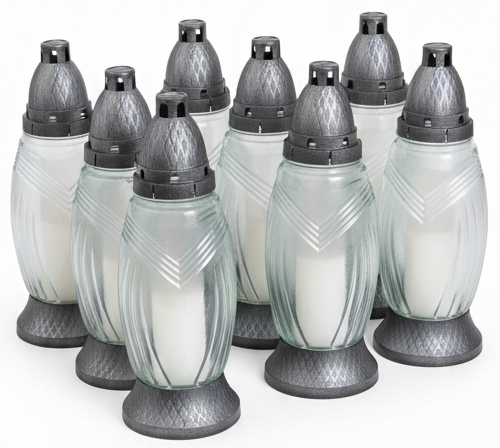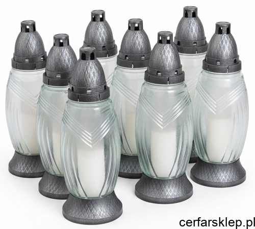 Każdy znicz charakteryzuje się unikalnym, zaokrąglonym kształtem szklanej obudowy, ozdobionej subtelnym, pionowym żłobieniem oraz wyraźnym, poziomym wzorem w kształcie litery "V" na frontowej części, co nadaje im nowoczesny i jednocześnie klasyczny wygląd.