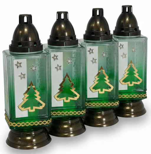 Kolorystyka: Szkło znicza utrzymane jest w głębokiej, butelkowej zieleni, która płynnie przechodzi w jaśniejsze tony, tworząc efekt ombre.
