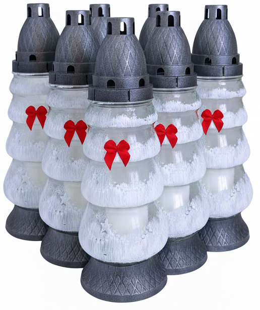 Akcent Dekoracyjny: Centralnym punktem dekoracji jest urocza, czerwona kokardka umieszczona na środku, dodająca zniczowi świątecznego charakteru. W dolnej części klosza widoczna jest delikatna gwiazdka.
