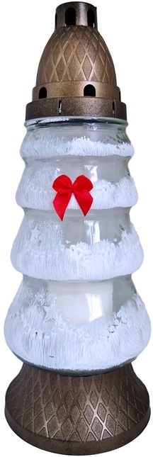 Akcent Dekoracyjny: Centralnym punktem dekoracji jest urocza, czerwona kokardka umieszczona na środku, dodająca zniczowi świątecznego charakteru. W dolnej części klosza widoczna jest delikatna gwiazdka.