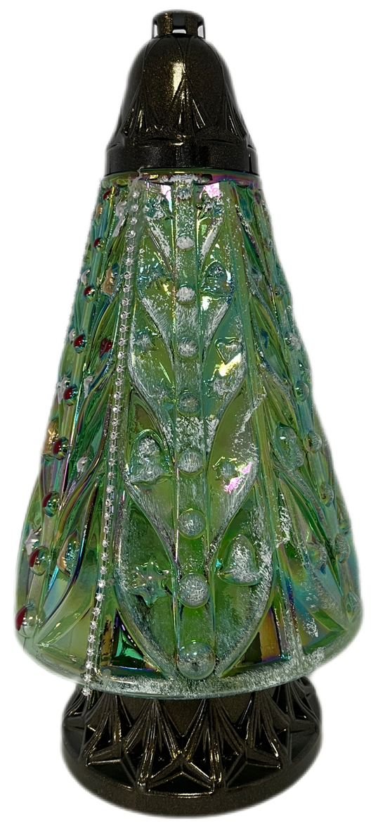 Ten elegancki znicz o stożkowym kształcie to wyjątkowa propozycja na okres świąteczny i zimowy. Jego korpus wykonany jest z grubego, iryzującego szkła w głębokim odcieniu butelkowej zieleni, która mieni się wszystkimi kolorami tęczy w zależności od kąta padania światła.
