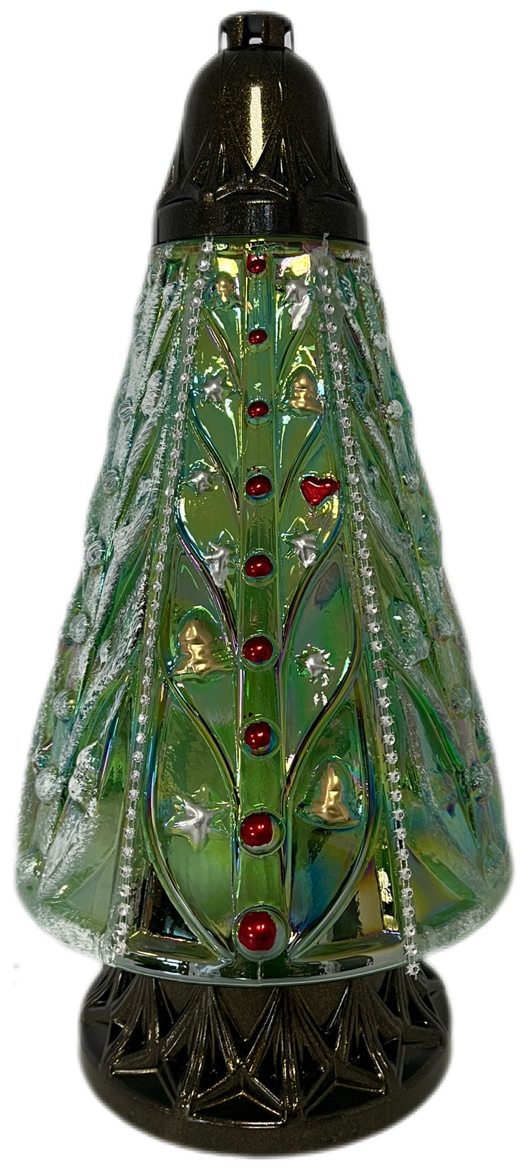 Szklana powierzchnia jest bogato zdobiona motywem stylizowanej choinki. W centralnym pasie znajdują się wypukłe, czerwone kule/perełki, które imitują ozdoby świąteczne. Po bokach widoczne są tłoczone detale, takie jak dzwonki, gwiazdki i serce, część z nich ma delikatne złote lub srebrne akcenty.
