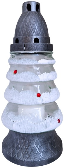 Unikatowy Design: Korpus znicza wykonany jest z grubego szkła w kształcie trzech poziomów przypominających ośnieżoną choinkę lub schodkowe kopuły. Biała, fakturowana powłoka imituje warstwy puchatego śniegu, tworząc magiczny, zimowy klimat.