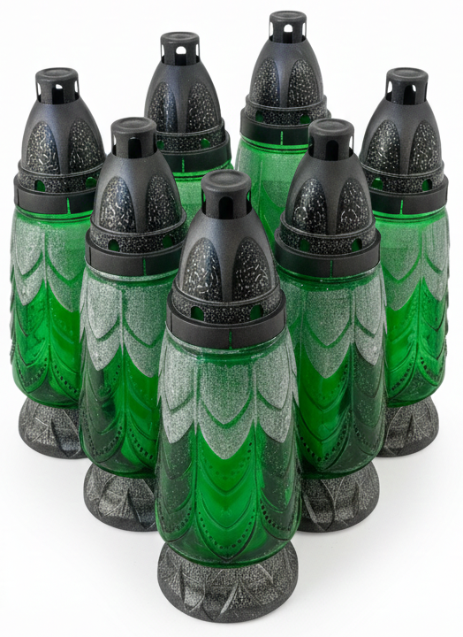 Design "Choinka": Wyrazisty, rzeźbiony wzór na szkle przypomina gałązki choinki, nadając zniczowi świąteczny i jednocześnie ponadczasowy charakter.