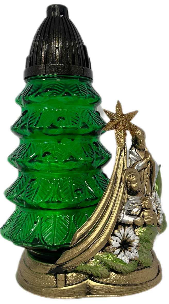 Kształt i Kolor Kaptura: Znicz posiada efektowny, zielony wkład stylizowany na choinkę, wykonany z grubego, lśniącego szkła. Żywy, szmaragdowy odcień pięknie rozprasza światło.