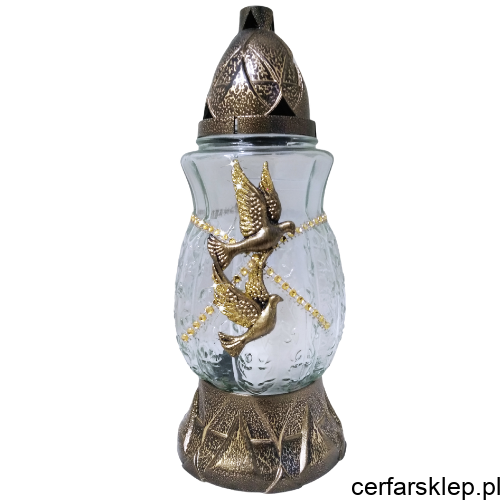Unikalny charakter znicza podkreślają ażurowe zdobienia na podstawie i pokrywie, a także delikatny motyw dwóch złotych gołębi w locie, oplecionych subtelnym złotym łańcuszkiem. Gołębie, symbol pokoju i pamięci, dodają zniczowi wyjątkowego, pełnego zadumy charakteru.