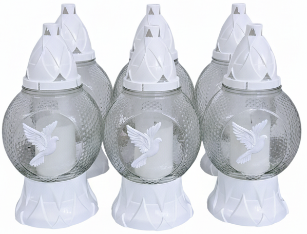 Ten subtelny, biały znicz emanuje spokojem i godnością, stanowiąc wzruszający sposób na uczczenie pamięci bliskiej osoby. Wykonany z przezroczystego szkła o ciekawej, fakturowanej powierzchni, w centralnej części zdobiony jest reliefem przedstawiającym białego gołębia w locie.