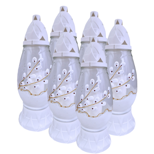 Stabilna Konstrukcja: Znicz stoi na solidnej, dekoracyjnej białej podstawie, a od góry jest zabezpieczony ozdobnym kapturem z geometrycznymi wycięciami, który chroni płomień przed wiatrem i deszczem.