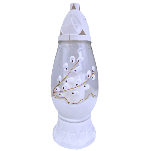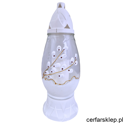 Wiosenne Zdobienie: Znicz jest ozdobiony pięknym, ręcznie malowanym motywem bazi (wierzbowych kotków). Białe, puszyste pąki na delikatnych, złotych gałązkach, wykończone ciemnymi akcentami, tworzą subtelną i naturalną kompozycję.