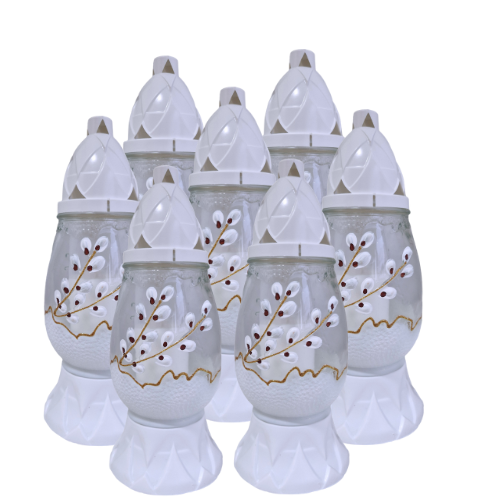 Stabilna Konstrukcja: Znicz stoi na solidnej, dekoracyjnej białej podstawie, a od góry jest zabezpieczony ozdobnym kapturem z geometrycznymi wycięciami, który chroni płomień przed wiatrem i deszczem.