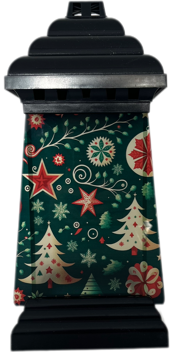 Design Świąteczny: Korpus znicza zdobi wyrazisty i gęsty wzór w dominujących odcieniach głębokiej zieleni i czerwieni. Wzór jest pełen motywów typowych dla świąt: