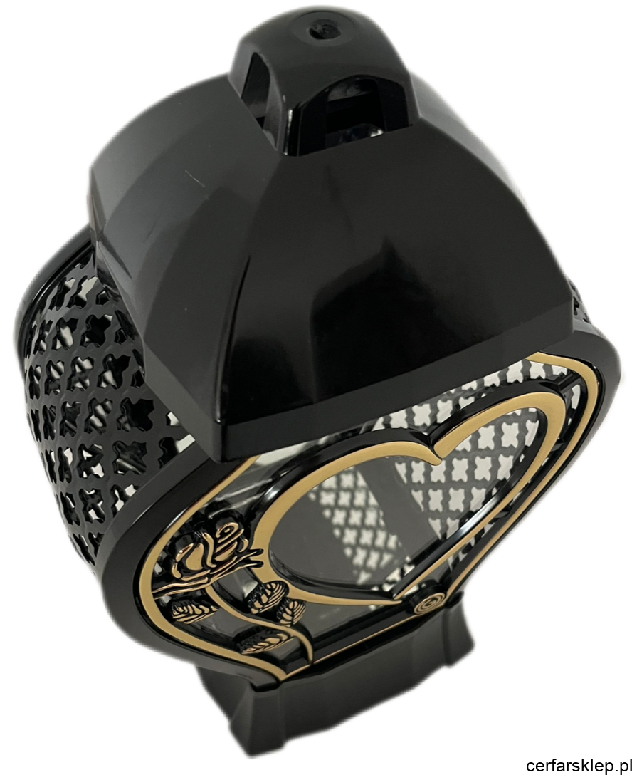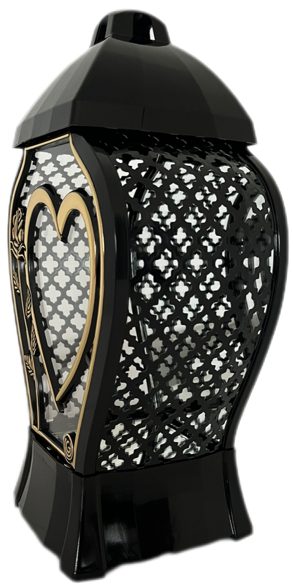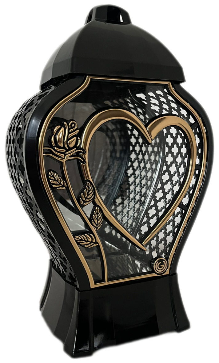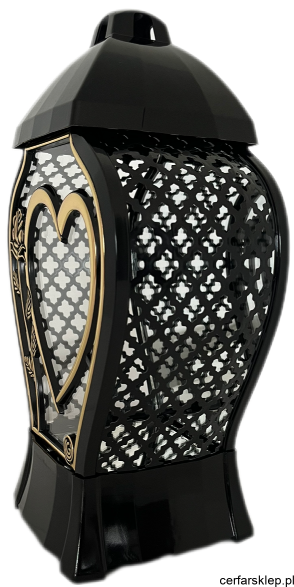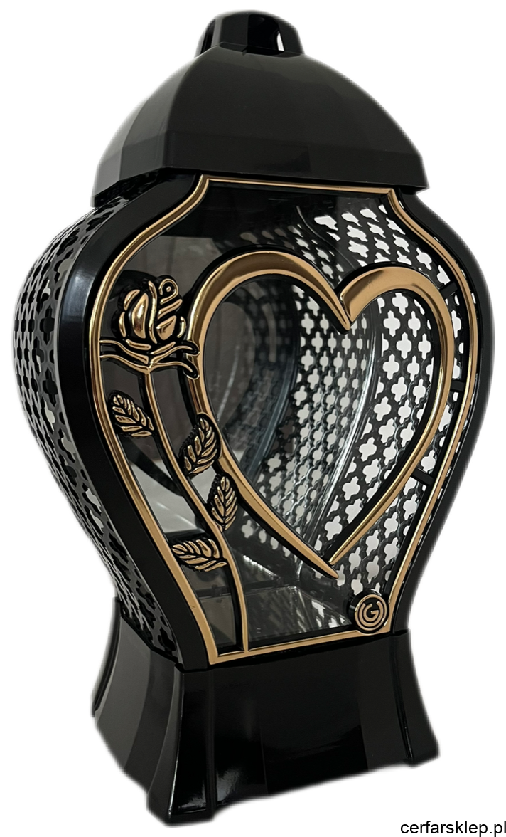 Złote Akcenty: Dekoracyjne, ażurowe panele boczne oraz ramki wykonane są w szlachetnym złotym kolorze, co dodaje zniczowi splendoru i luksusowego wykończenia.