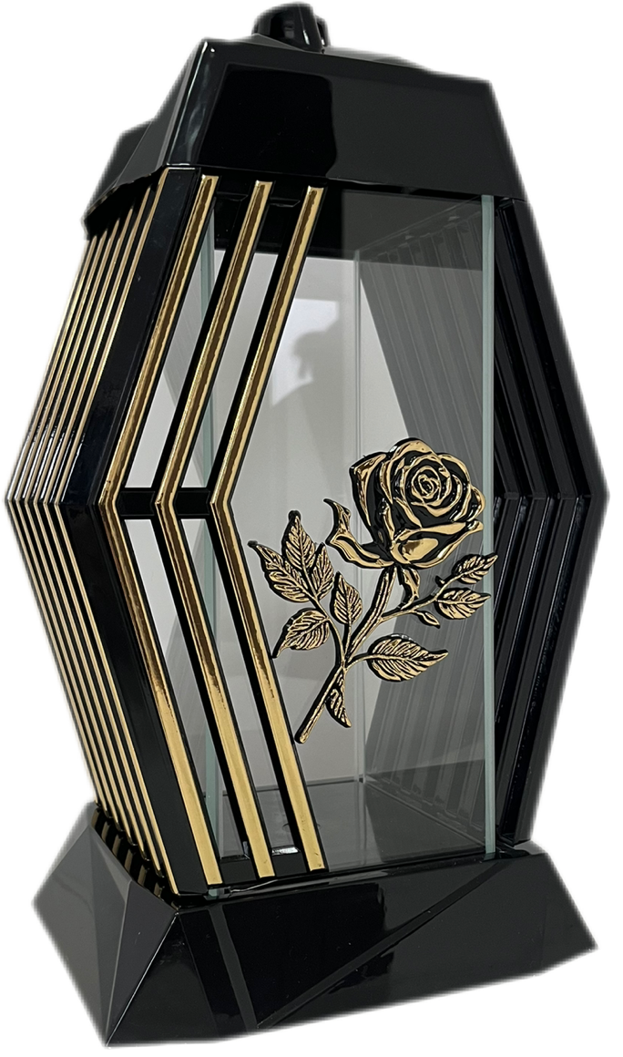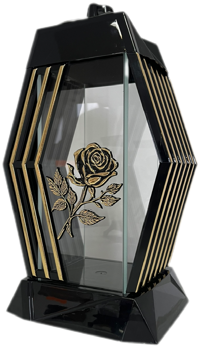 Symboliczna Dekoracja: Centralnym punktem jest złota, metalizowana róża z liśćmi, umieszczona na szkle. Róża to ponadczasowy symbol miłości, szacunku i pamięci.