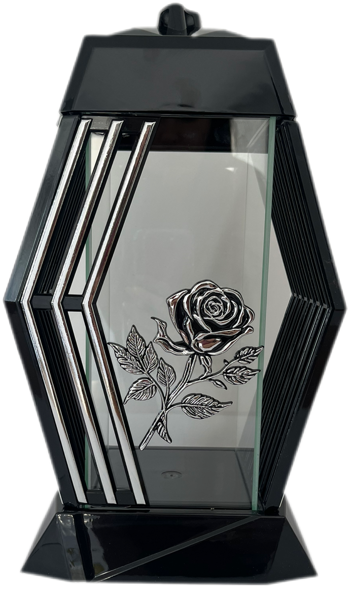 Symboliczna Dekoracja: Centralnym punktem jest srebrna, metalizowana róża z liśćmi, umieszczona na szkle. Róża to ponadczasowy symbol miłości, szacunku i pamięci.