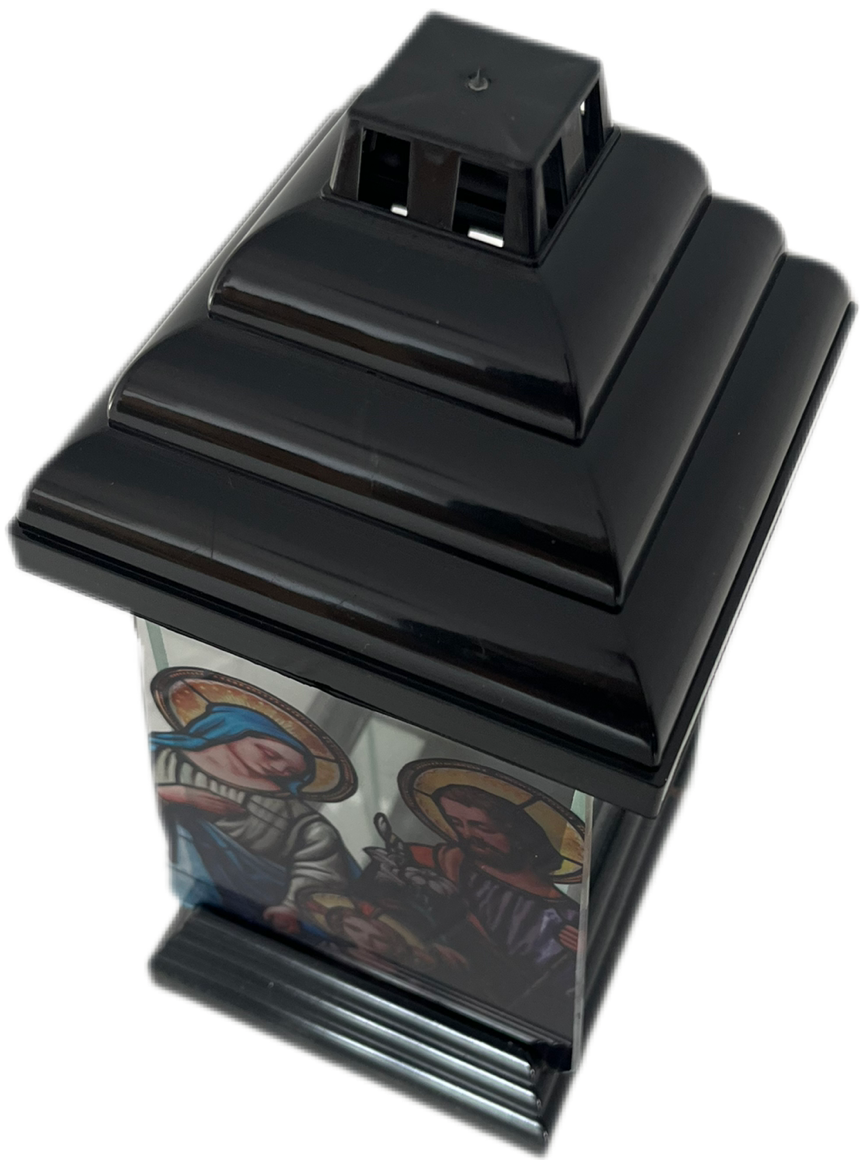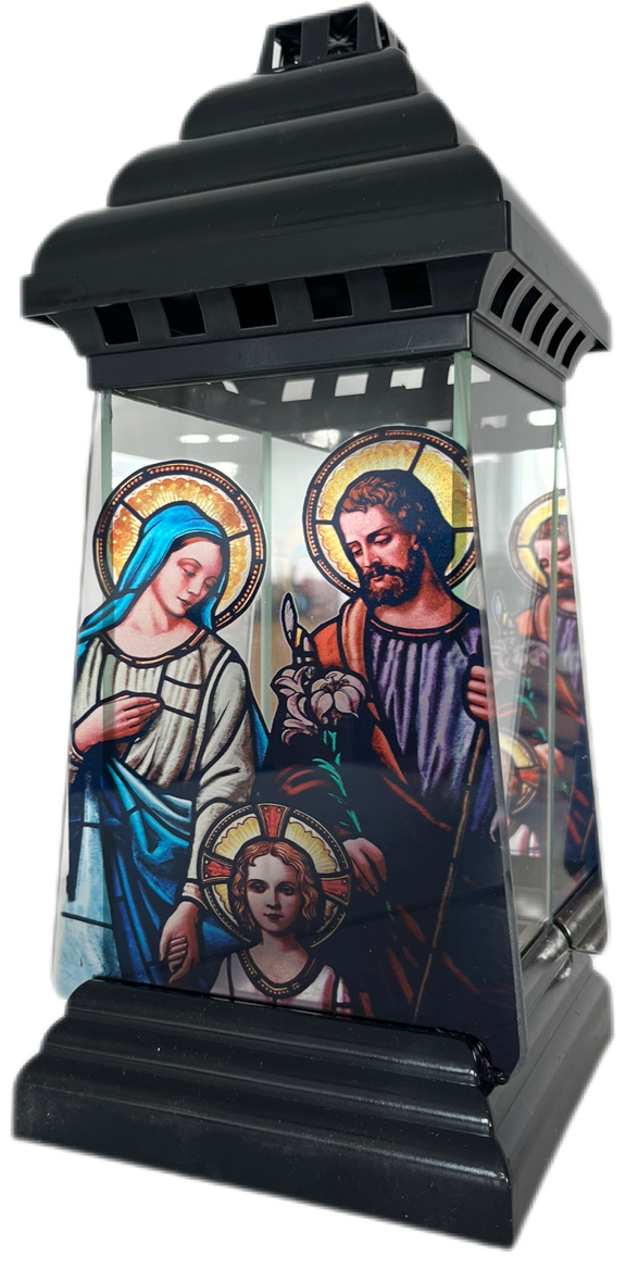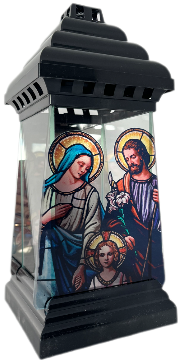 Witrażowy Wizerunek Świętej Rodziny: Na przezroczystych ściankach lampionu umieszczono wysokiej jakości, kolorowe grafiki stylizowane na witraże. Przedstawiają one Jezusa, Maryję i Św. Józefa, wprowadzając element sakralny i artystyczny.