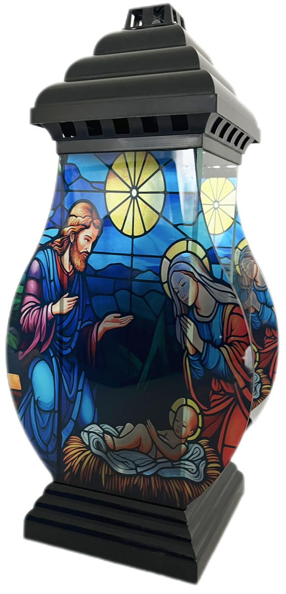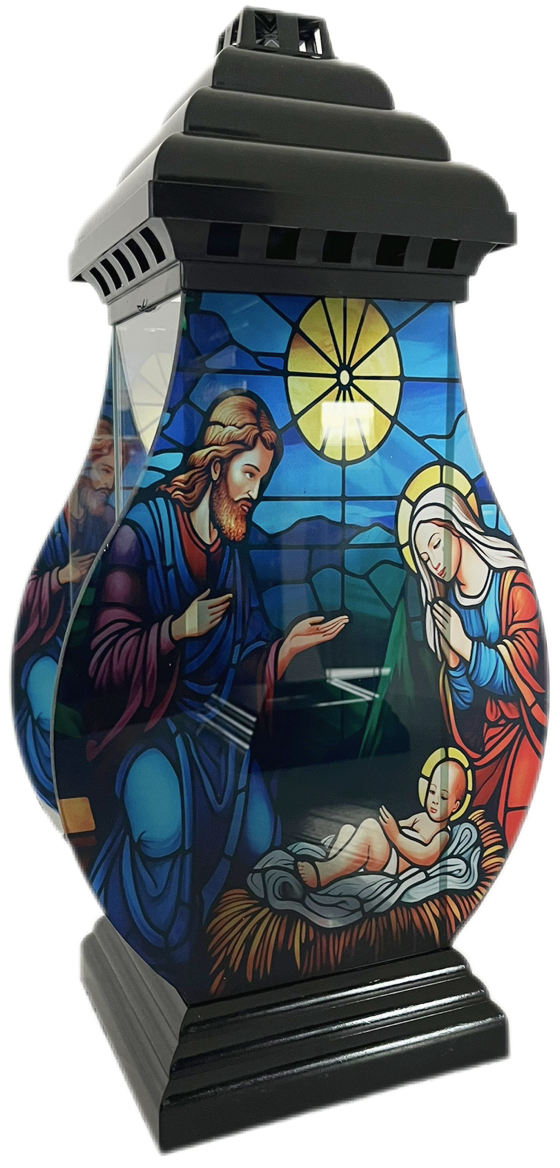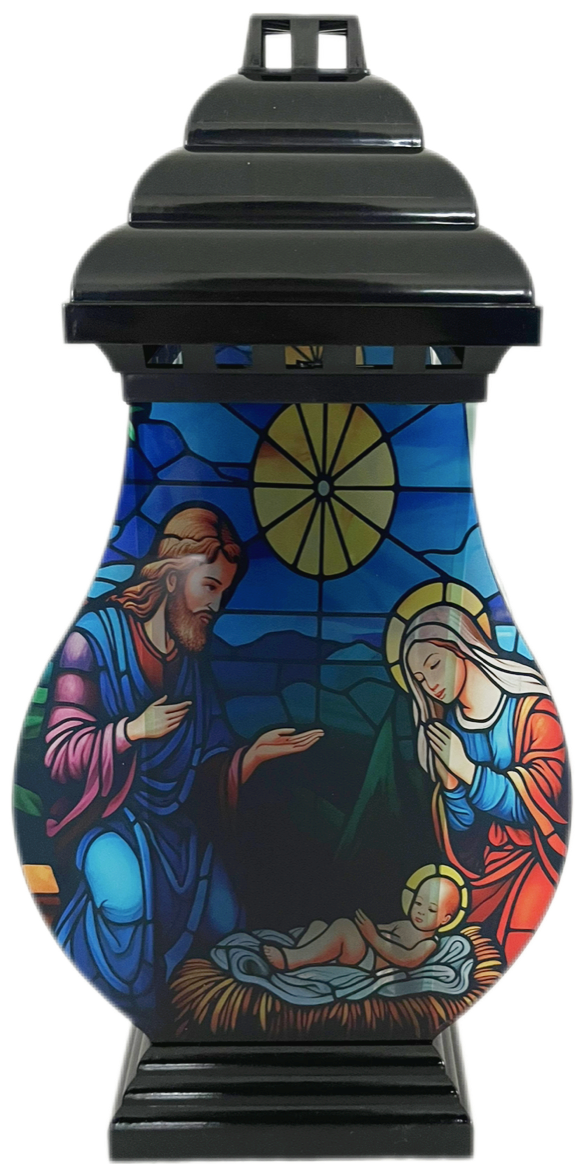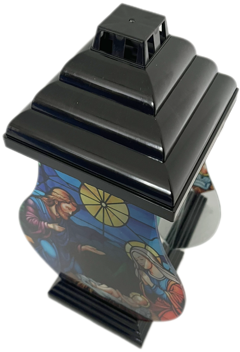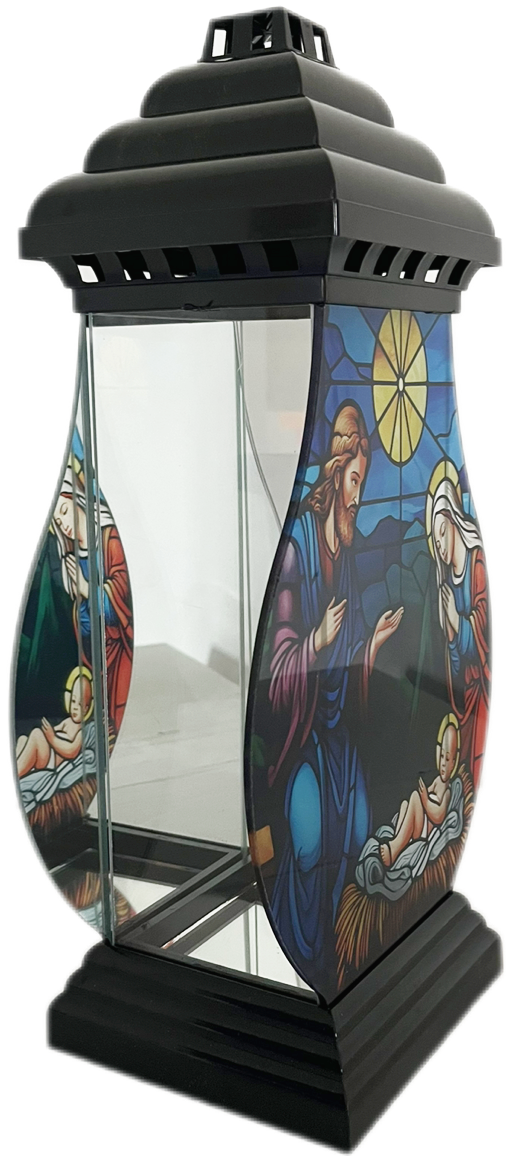 Motyw: Przepiękna, pełna głębi scena Narodzenia Pańskiego – Maryja i Józef czuwający nad Dzieciątkiem Jezus. Scena jest przedstawiona w stylistyce witrażu, co nadaje zniczowi uroczystego i artystycznego charakteru.