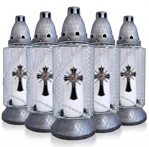 Elegancki Znicz Szklany ze Srebrnym Krzyżem z wymiennym wkładem parafinowym