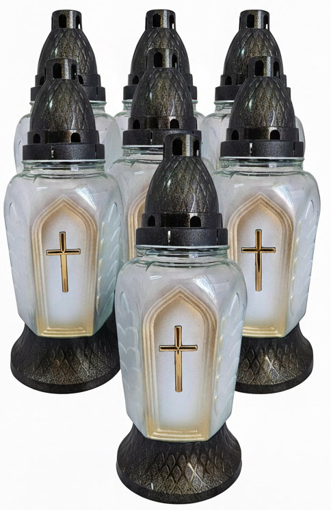 Wytrzymała Konstrukcja: Znicz wykonany jest z grubego, przezroczystego szkła, które zapewnia ochronę płomienia przed wiatrem i deszczem, a także długotrwałe użytkowanie.