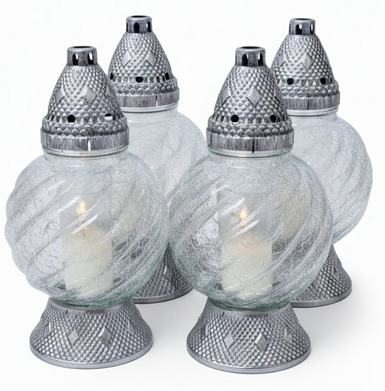 Srebrzyste Akcenty: Podstawa i kapturek znicza utrzymane są w eleganckim srebrnym kolorze, z wytłoczonym, geometrycznym wzorem, który pięknie komponuje się z "mrożonym" szkłem i dodaje całości szlachetnego charakteru.