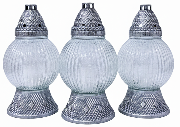 • Srebrne Akcenty: Podstawa i kapturek znicza utrzymane są w klasycznym, srebrnym kolorze, który doskonale kontrastuje z delikatnością szkła. Ich ozdobna, geometryczna faktura dodaje zniczowi szlachetności i elegancji.