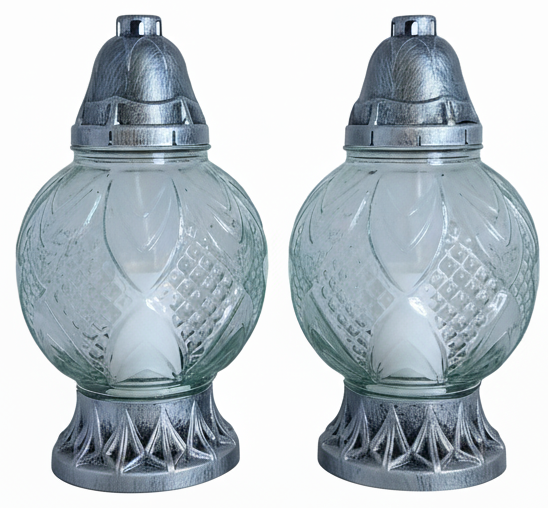 Klasyczny znicz o kształcie bańki, wykonany z grubego szkła z ozdobnymi tłoczeniami. Srebrna podstawa i pokrywa nadają mu eleganckiego wyglądu. Idealny do upamiętnienia bliskich na grobach.