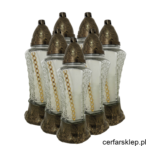 Elegancki i ponadczasowy znicz, który wyróżnia się unikalnym zdobieniem oraz wysoką jakością wykonania. Połączenie klasycznego, transparentnego szkła z subtelnymi detalami w kolorze antycznego złota sprawia, że jest to idealny wybór dla osób szukających estetycznych i godnych produktów pamięci.