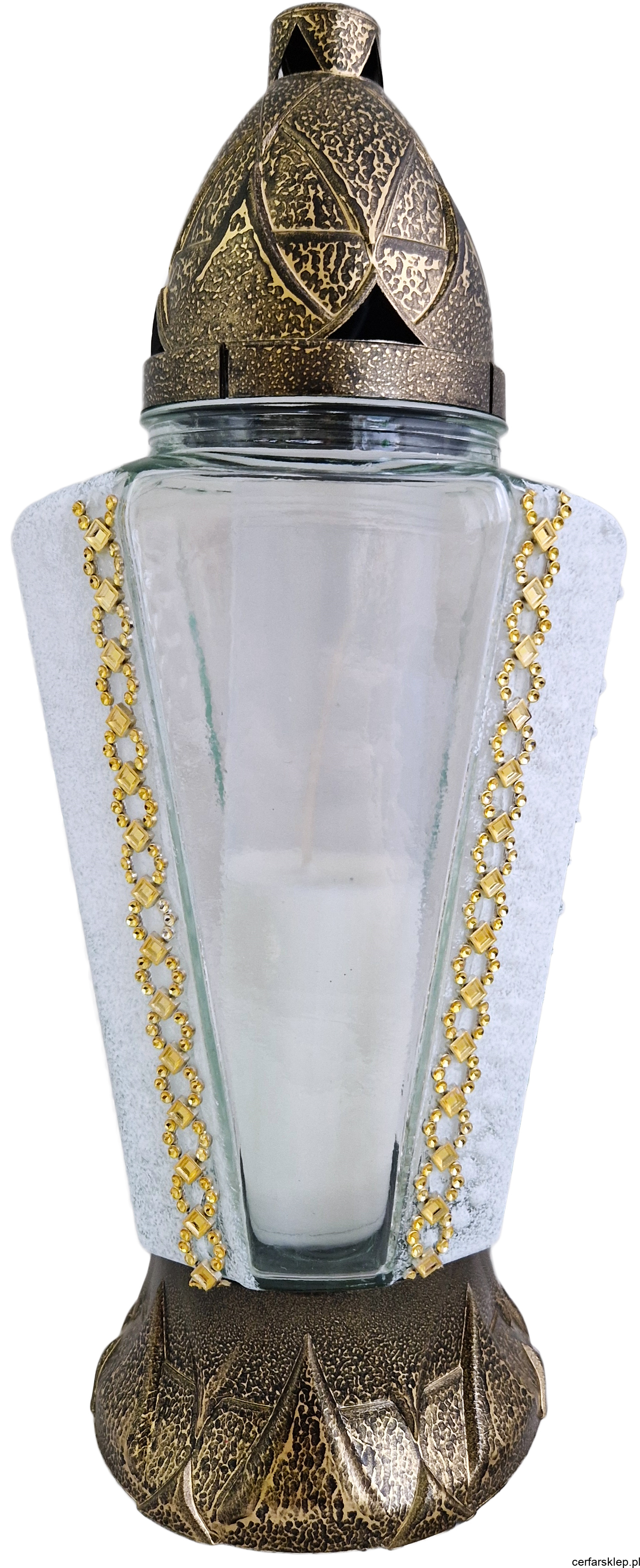 Znicz szklany, który zachwyca swoim wyglądem i dbałością o detale. Wykonany z solidnego szkła o nowoczesnym, geometrycznym kształcie. Ścianki znicza zdobią pionowe pasy z delikatnymi, połyskującymi złotymi i srebrnymi cyrkoniami, które dodają mu subtelnego blasku i luksusowego charakteru.
