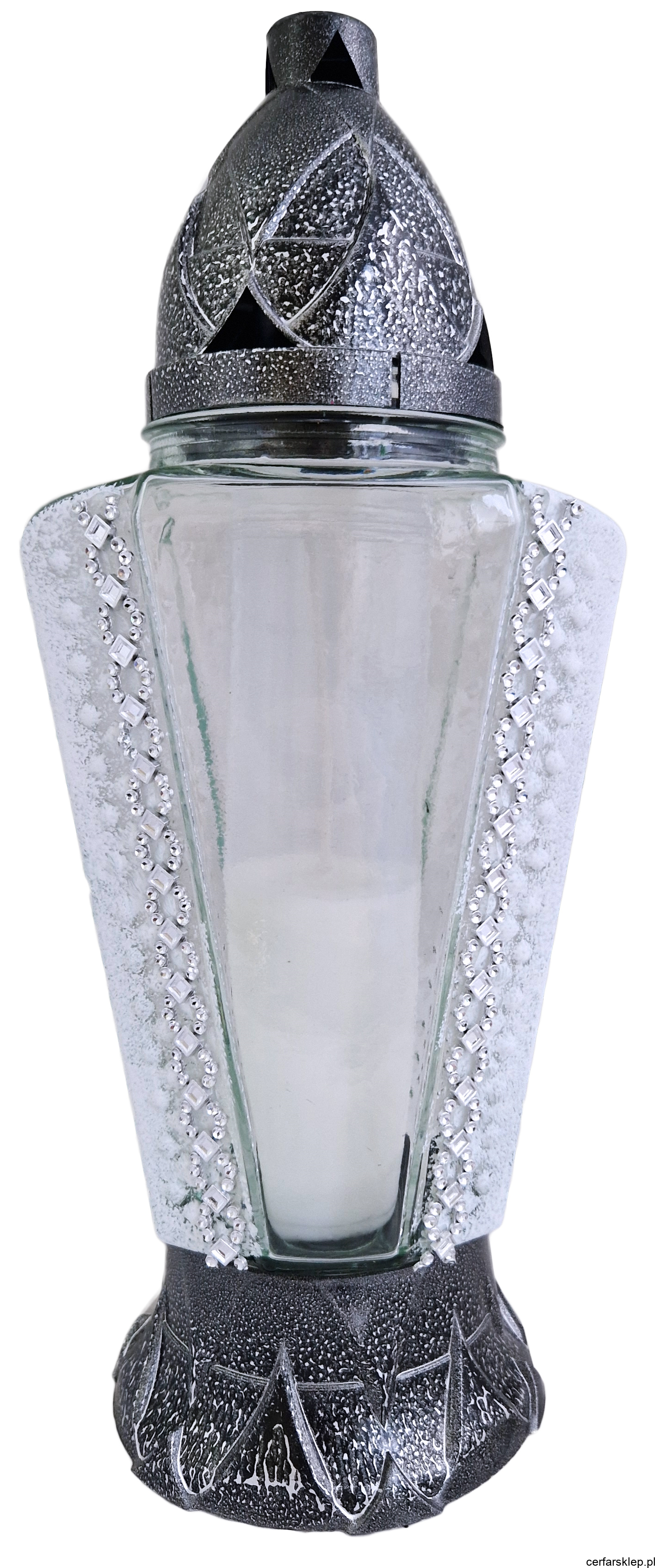 Znicz szklany, który zachwyca swoim wyglądem i dbałością o detale. Wykonany z solidnego szkła o nowoczesnym, geometrycznym kształcie. Ścianki znicza zdobią pionowe pasy z delikatnymi, połyskującymi złotymi i srebrnymi cyrkoniami, które dodają mu subtelnego blasku i luksusowego charakteru.