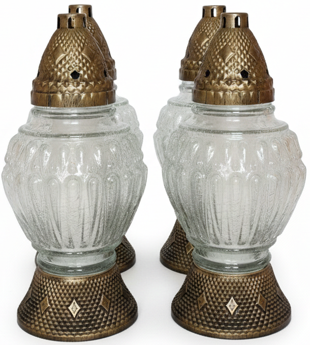 Przedstawiamy nasz klasyczny znicz, który łączy tradycyjny urok z wyrafinowanym designem. Jego szklana lampionowa część, choć przezroczysta, została ozdobiona misternym, pionowym wzorem przypominającym delikatne mrożenie lub szklane reliefy, które pięknie rozpraszają światło. Całość dopełniają eleganckie, złote akcenty, nadające zniczowi dostojnego charakteru.