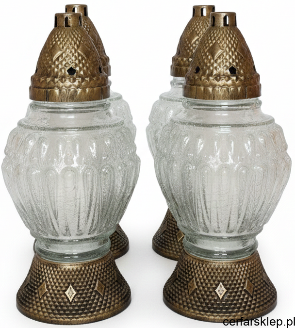 Przedstawiamy nasz klasyczny znicz, który łączy tradycyjny urok z wyrafinowanym designem. Jego szklana lampionowa część, choć przezroczysta, została ozdobiona misternym, pionowym wzorem przypominającym delikatne mrożenie lub szklane reliefy, które pięknie rozpraszają światło. Całość dopełniają eleganckie, złote akcenty, nadające zniczowi dostojnego charakteru.