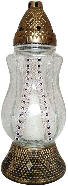 • Złote Akcenty: Podstawa i kapturek znicza utrzymane są w szlachetnym, złotym kolorze, z wytłoczonym geometrycznym wzorem. Złote wykończenia doskonale komponują się z "mrożonym" szkłem i blaskiem kryształków, tworząc spójną i luksusową całość.