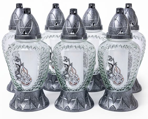 Elegancki znicz całoroczny o klasycznym, zaokrąglonym kształcie. Grube, przeźroczyste szkło zostało subtelnie ozdobione fakturowanym wzorem w kształcie wianka. Centralnym punktem jest metalizowana, srebrna aplikacja róży z liśćmi, nadająca lampionowi wyjątkowej delikatności. Podstawa i ozdobna pokrywa z otworami wentylacyjnymi wykonane są z tworzywa o metalicznym, "przecieranym" srebrnym wykończeniu, co gwarantuje stabilność i stylowy wygląd. Idealny, by wyrazić pamięć i szacunek.