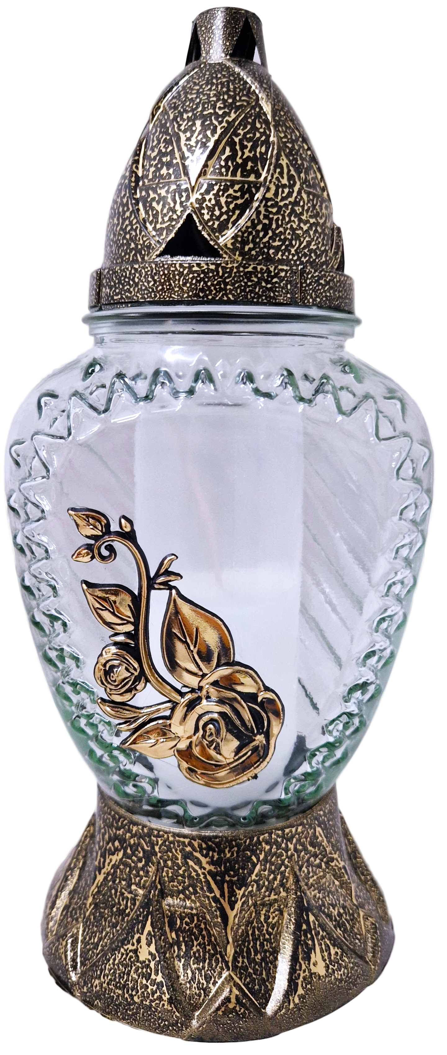 Elegancki znicz całoroczny o klasycznym, zaokrąglonym kształcie. Grube, przeźroczyste szkło zostało subtelnie ozdobione fakturowanym wzorem w kształcie wianka. Centralnym punktem jest metalizowana, złota aplikacja róży z liśćmi, nadająca lampionowi wyjątkowej delikatności. Podstawa i ozdobna pokrywa z otworami wentylacyjnymi wykonane są z tworzywa o metalicznym, "przecieranym" złotym wykończeniu, co gwarantuje stabilność i stylowy wygląd. Idealny, by wyrazić pamięć i szacunek.