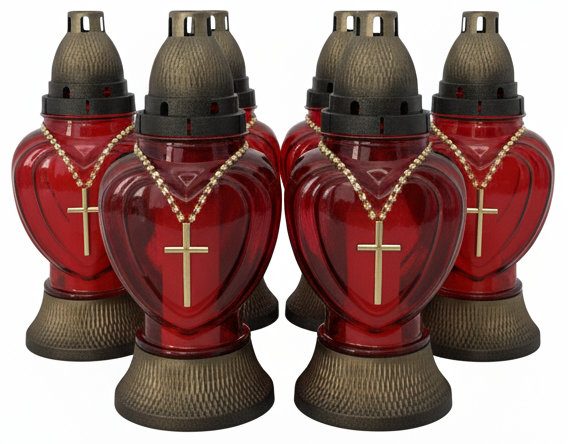 Centralnym elementem znicza jest misternie wykonany złoty krzyż, który dodaje mu sakralnego charakteru i podkreśla duchowe znaczenie pamięci o bliskich. Krzyż jest subtelnie umieszczony na przedniej ściance serca, tworząc wyrazisty, ale nieprzytłaczający akcent.