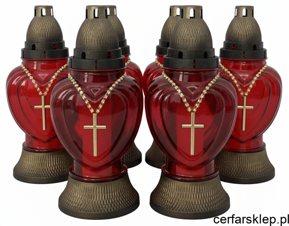 Dodatkowego blasku dodaje złoty łańcuszek, który delikatnie otacza górną część serca, łącząc je z ażurową, metalową nakładką w kolorze ciemnego złota. Nakładka nie tylko pięknie się prezentuje, ale również chroni płomień przed wiatrem i deszczem, zapewniając długotrwałe palenie. Ten wyjątkowy znicz jest wyrazem pamięci i miłości, który w piękny i godny sposób uczci wspomnienie o tych, którzy odeszli.