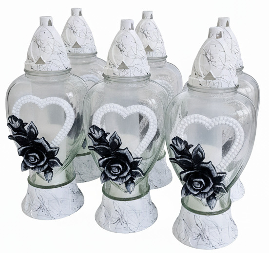 Przedstawiamy Państwu wyjątkowy znicz szklany w kształcie serca, który łączy w sobie elegancję i symboliczne motywy. Wykonany z wysokiej jakości, przezroczystego szkła, zdobiony subtelnymi, białymi koralikami ułożonymi w kształt serca wewnątrz.