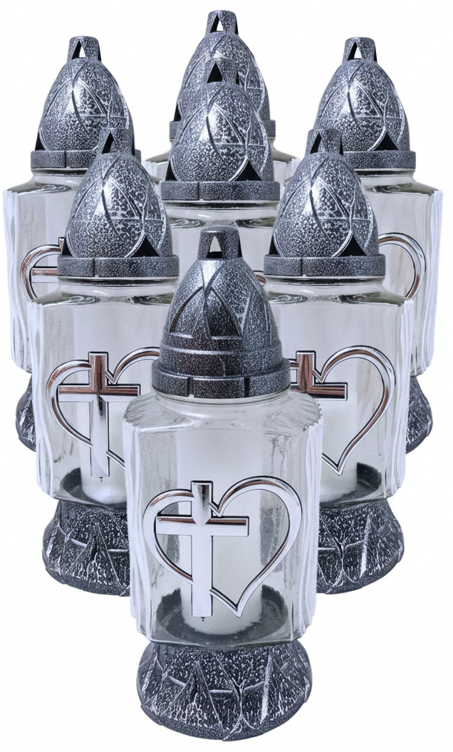 Elegancki Znicz Szklany Owalny ze Srebrnym Krzyżem i Wkładem Parafinowym
