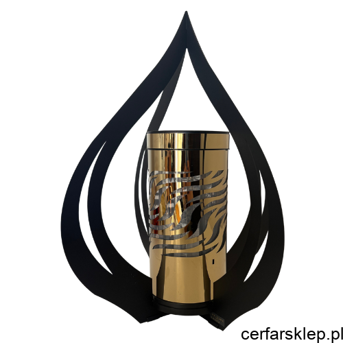 Efektowny Design: Obudowa w kształcie stylizowanego, czarnego płomienia otacza złoty, lustrzany wkład. Ażurowe wycięcia we wkładzie sprawiają, że światło przenika przez nie w sposób subtelny i nastrojowy.