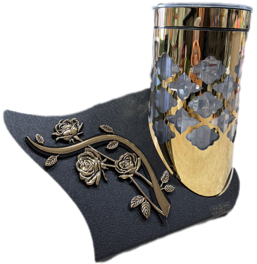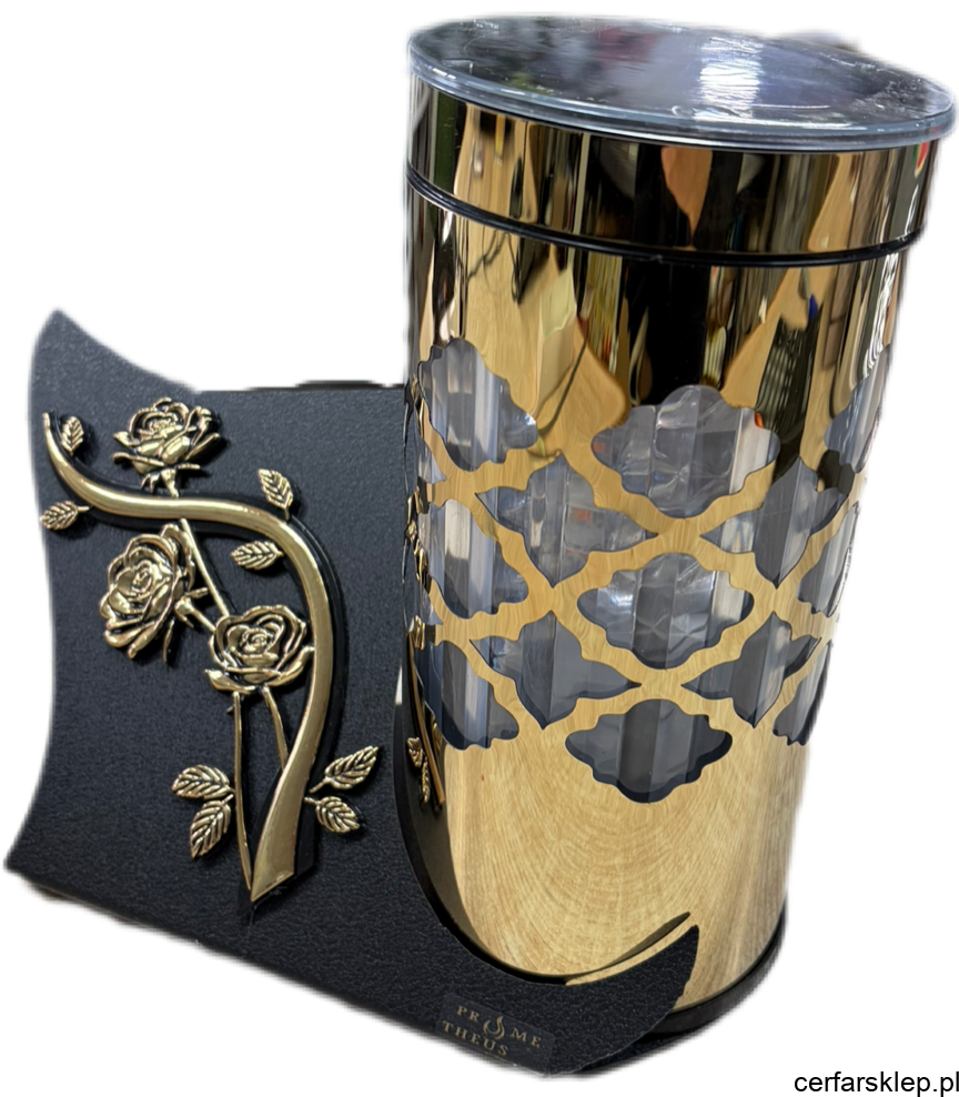 Unikalny design: Znicz umieszczony jest na stabilnej, grafitowej podstawie o asymetrycznym kształcie, którą zdobi misterna aplikacja w formie złotych róż.