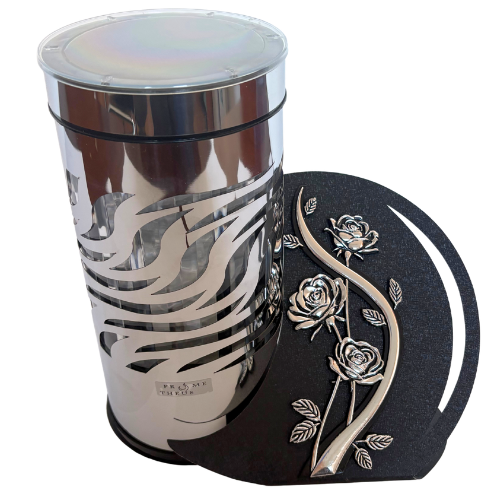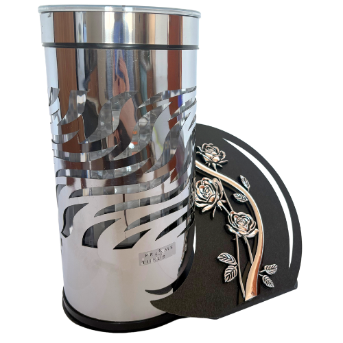 Nowoczesny Design: Znicz wyróżnia się unikalną, ażurową obudową w wysokim połysku. Metaliczne wykończenie pięknie odbija światło, nadając otoczeniu grobu podniosły charakter.