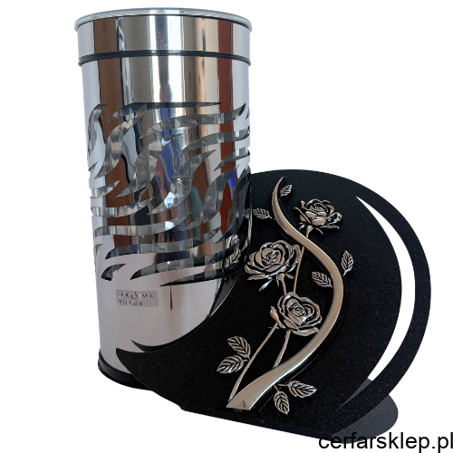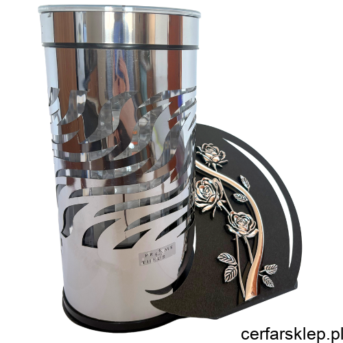 Artystyczna Podstawa: Szeroka, czarna podstawa o matowej strukturze została ozdobiona precyzyjnym motywem srebrnych róż oraz elegancką linią, co tworzy spójną i stylową kompozycję.