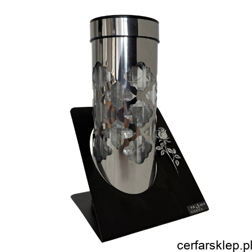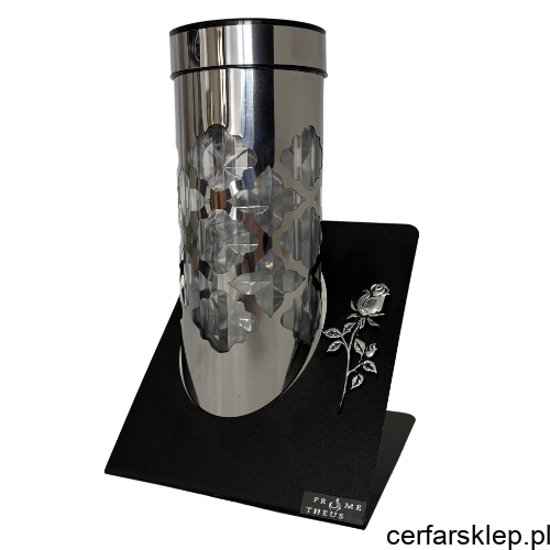 Symboliczna Dekoracja: Stabilna, czarna podstawa została ozdobiona subtelną, srebrną aplikacją w formie róży, co nadaje całości podniosłego i osobistego charakteru.