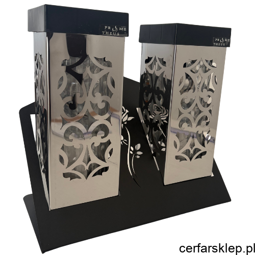 Podwójna kompozycja: Zestaw składa się z dwóch lampionów umieszczonych na solidnej, czarnej podstawie, co tworzy spójną i monumentalną całość.