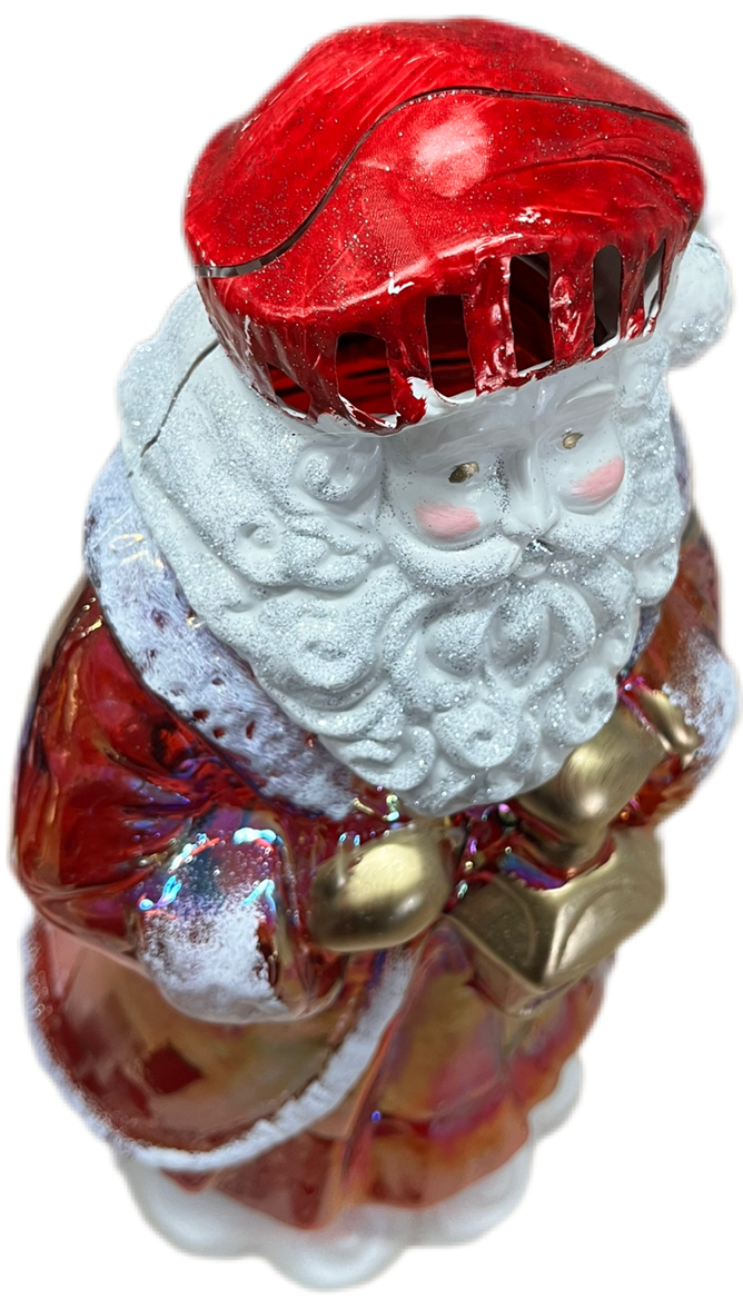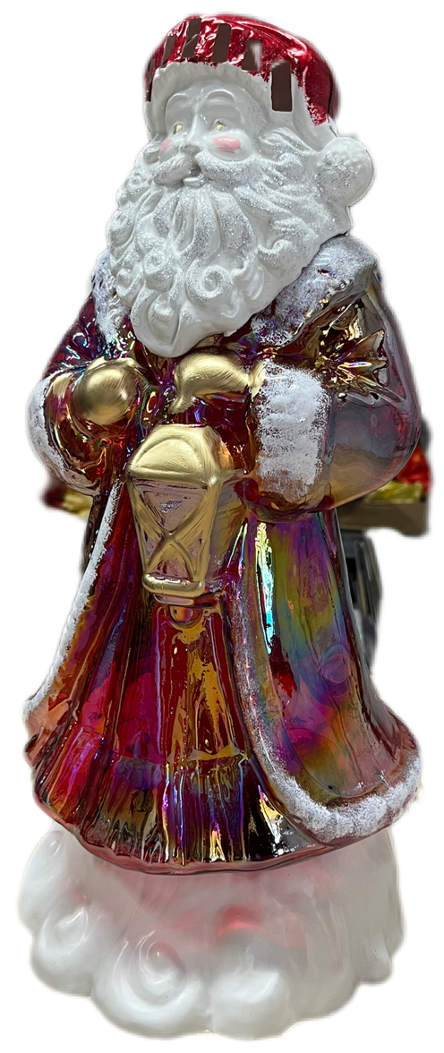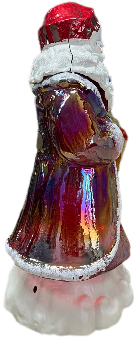 Wyjątkowy Efekt Wizualny: Figurka wykonana jest z masy szklanej lub tworzywa o lustrzanym, mieniącym się wykończeniu (efekt irydyzacji). Szaty Mikołaja prezentują bogatą paletę barw: od głębokiej czerwieni, przez złoto, po fioletowe i tęczowe refleksy, które pięknie odbijają światło.