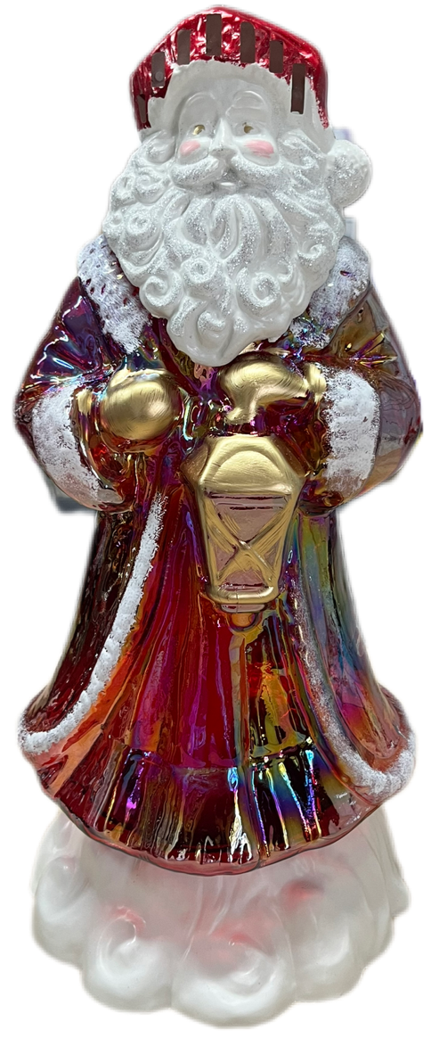 Detale: Mikołaj jest precyzyjnie wykonany, ma gęstą, białą brodę (wykończenie matowe/brokatowe) oraz niesie złotą latarnię, która jest symbolem przewodnictwa i nadziei.