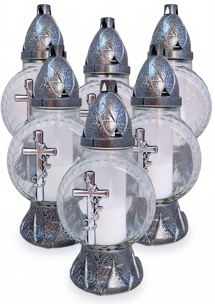 Elegancki Znicz Szklany z Metalowym Krzyżem i Wkładem Parafinowym